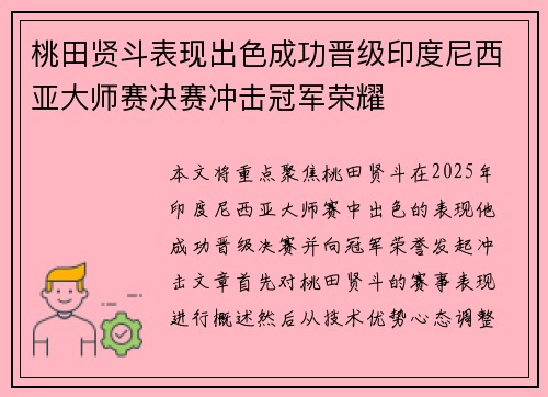 本文将重点聚焦桃田贤斗在2025年印度尼西亚大师赛中出色的表现,他成功晋级决赛并向冠军荣誉发起冲击。文章首先对桃田贤斗的赛事表现进行概述,然后从技术优势、心态调整、比赛策略与对手分析等四个方面详细探讨桃田贤斗如何一步步走向决赛。在这篇文章中,我们将分析他在比赛中的表现细节,探讨他的技术特点,以及他如何克服种种挑战,展现出世界级羽毛球选手的风采。最后,通过总结桃田贤斗在赛事中的经验,展望他未来在羽毛球世界舞台上的更高成就。